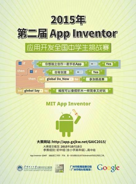 App Inventor是美国麻省理工学院推出的一款完全在线开发的Android编程环境,它简单,易学,又具有趣味性,特别适合中小学生的学习,学生在学习过程中,既可以培养计算思维,又可以激发创造能力。2015年第二届App Inventor应用开发全国中学生挑战赛将于2015年10月份举行(http://app.gzjkw.net/GAIC2015/),培训结束后,计算机信息工程学院将进一步帮助中学信息技术教师指导中学生参加App Inventor应用开发大赛,以推进我省中小学信息技术的教育教学水平。
