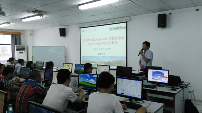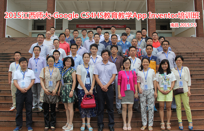 2015年7月4日-7日,由计算机信息工程学院与Google公司联合举办的CS4HS(Computer Science for High School)中小学教师信息技术与教育教学App Inventor培训班在江西师大瑶湖校区先骕楼计算机信息工程学院机房举行。
