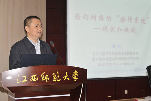 11月18日上午,计算机信息工程学院、研究生院特邀请北京大学梅宏教授在白鹿会馆二楼会议室作"面向网络的'操作系统'-现状和挑战"的讲座。讲座由副校长黄加文主持,200多名师生聆听了本次讲座。