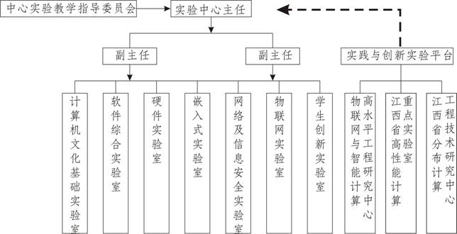 实验中心是江西省实验示范中心,依托计算机信息工程学院,实施校、院两级管理,中心主任由学校任命,由具有丰富理论和实验教学经验、热爱实验教学工作的教授担任,配备两名副主任,负责实验教学中心的实验教学和日常管理工作。中心实行主任负责制,全面负责实验中心的建设、教学、研究和管理等工作。副主任负责组织实验教学实施、实验设备采购、实验教材建设、实验安全检查、实验队伍建设等工作。下设各实验室主任由中心主任聘任,负责实验课程教学管理、实验教学大纲制定、实验室设备采购、实验项目改革、实验教材撰写等。实验室专业技术人员负责实验技术操作指导、实验仪器设备维护和实验室日常管理。
